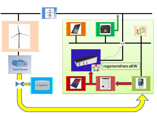 In sonnenreichen Monaten erfolgt die Versorgung weitestgehend Solar, sowohl thermisch als auch elektrisch. Den Nacht-Tag Ausgleich übernehmen Kurzzeitspeicher. Der Jahresausgleich erfolgt durch Langzeitspeicher auf Basis regenerativ erzeugtem Wasserstoff vornehmlich aus Großwindanlagen. Dieser wird dezentral und verbrauchsnah in Kraft-Wärme-Kopplungs-Anlagen (KWK) mit hohem Wirkungsgrad in elektrische und thermische Energie gewandelt. Kleinwindanlagen können Standortnah eine Ausgleichsfunktion übernehmen und andere Energieformen (z.B. Druckluft, Kälte) effizient bedienen. Mit unserem Projekt wollen wir die verbrauchernahen Strukturen abbilden!